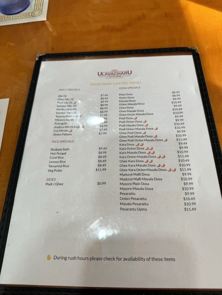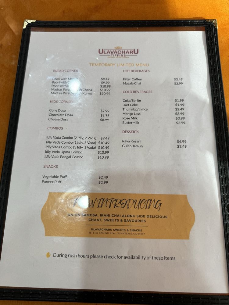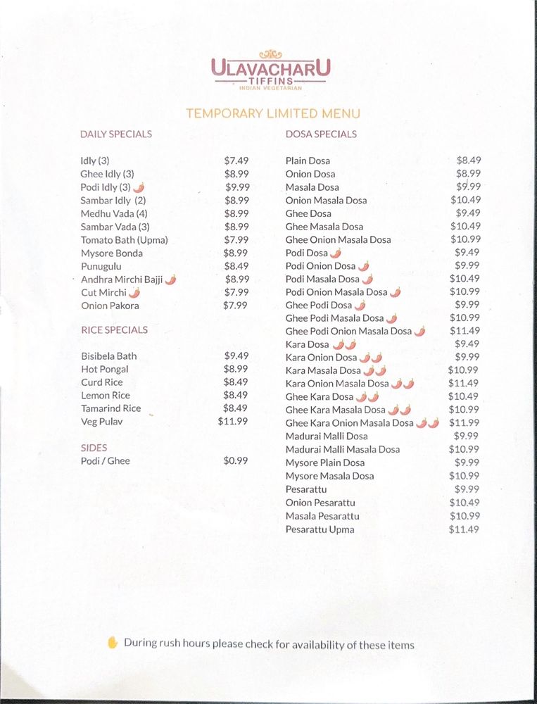 UlavacharU Tiffins is a popular Indian vegetarian restaurant located in Campbell, CA. Known for its diverse menu and delicious offerings, this eatery offers daily specials like Cocktail Samosa and Andhra Mirchi Bajji. Customers rave about the variety of dosas and idlis available, with standout dishes like the Mysore Masala Dosa and Podi Idli. The cozy and welcoming atmosphere, along with attentive service, adds to the overall dining experience. With options for both solo diners and large groups, UlavacharU Tiffins caters to a wide range of tastes. Don't miss their homemade chutneys and unique offerings like the Madurai Malli Dosa. Whether you're a dosa lover or looking to try something new, UlavacharU Tiffins is a must-visit destination for authentic South Indian cuisine.